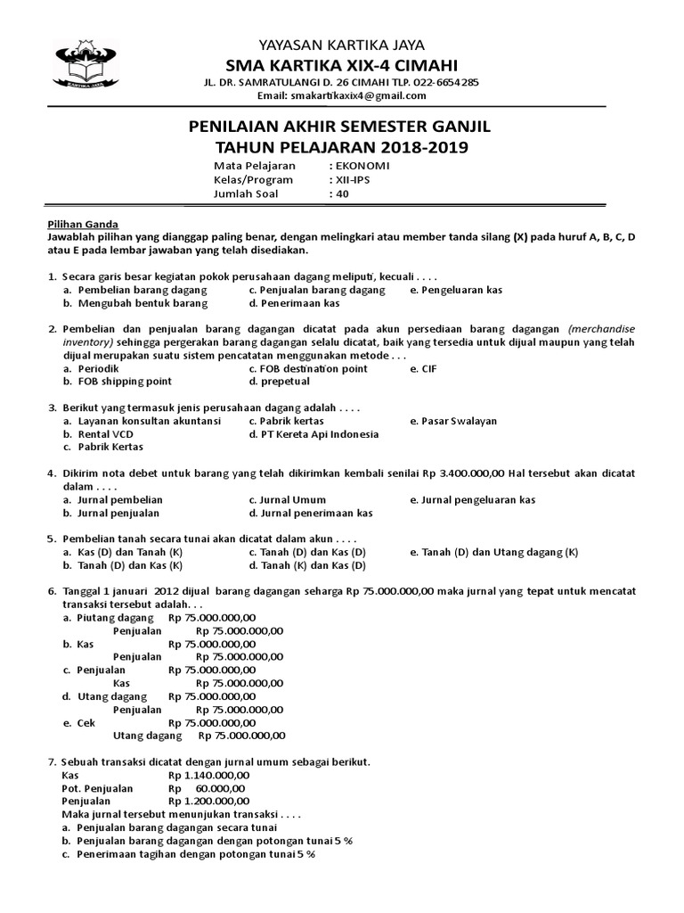 Soal Ekonomi Kelas 12 Xii Sma Ma Stm Soal Pg Essay 2021 from materibelajar.co.id Soal pilihan ganda tentang jurnal kusus perusahaan dagang kelas xi beserta jawabannya. Soal myob akuntansi perusahaan dagang dan penyelesaiannya, kunci jawaban, pembahasan, soal komputer akuntansi smk perusahaan dagang. Contoh tabel jurnal khusus perusahaan dagang. Instrumen yang tidak dapat digunakan dalam transaksi pasar modal adalah … a. Itulah tadi transaksi jurnal umum perusahaan jasa, semoga dari contoh di atas akan membantu anda dan menambah wawasan tersendiri bagi anda. Soal pilihan ganda tentang jurnal kusus perusahaan dagang kelas xi beserta jawabannya : Contoh soal uts ekonomi kelas xii semester 1 beserta jawabannya (pg dan essay). Sebagaimana telah kita pada bahas pada tulisan sebelumnya mengenai contoh soal jurnal umum perusahaan dagang kali ini kita akan membahas mengenai jurnal khusus perusahaan dagang khususnya tentang contoh soal jurnal.